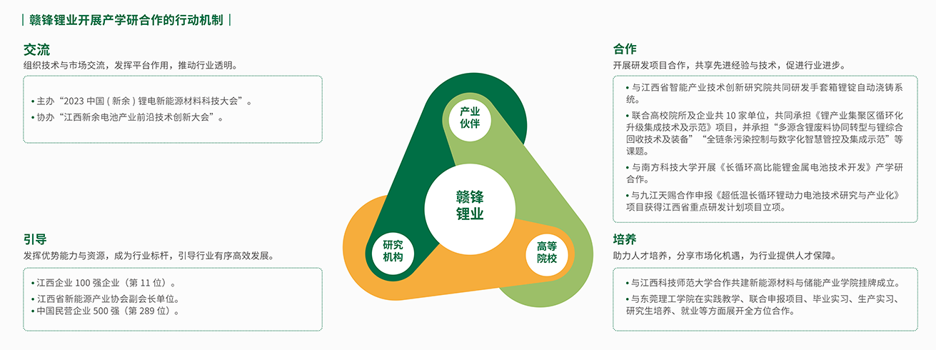 贛鋒鋰業(yè)秉持“開放、合作、共贏”理念,積極參與行業(yè)技術(shù)合作,充分發(fā)揮自身先進(jìn)技術(shù)優(yōu)勢(shì),與產(chǎn)業(yè)伙伴、研究機(jī)構(gòu)、高等院校開展技術(shù)交流與指導(dǎo)、合作研發(fā)、人才培養(yǎng)項(xiàng)目,帶動(dòng)行業(yè)全面升級(jí),通過(guò)共建科研機(jī)構(gòu)、共同承擔(dān)國(guó)家(省級(jí))重大科技項(xiàng)目、聯(lián)合開展技術(shù)攻關(guān)等形式,大幅提升企業(yè)科技創(chuàng)新能力,并榮獲“江西省對(duì)外合作基地與引智示范基地”稱號(hào)。